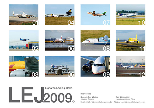 Jedes Jahr entsteht ein Kalender mit Flugzeugmotiven am Flughafen Leipzig/Halle. Die schönsten Motive des Jahres werden vielseitig erläutert, mit genauem Typ und Gesellschaft benannt. um im Format DIN A 3, randlos in Farbe, gegliedertem Kalendarium, Ringbindung, für monatelanges Vergnügen zu sorgen. Der Kalender ensteht in Zusammenarbeit mit der Mediengestaltung Wiese (Leipzig) und dem Verlag Ille & Riemer Leipzig - Weißenfels